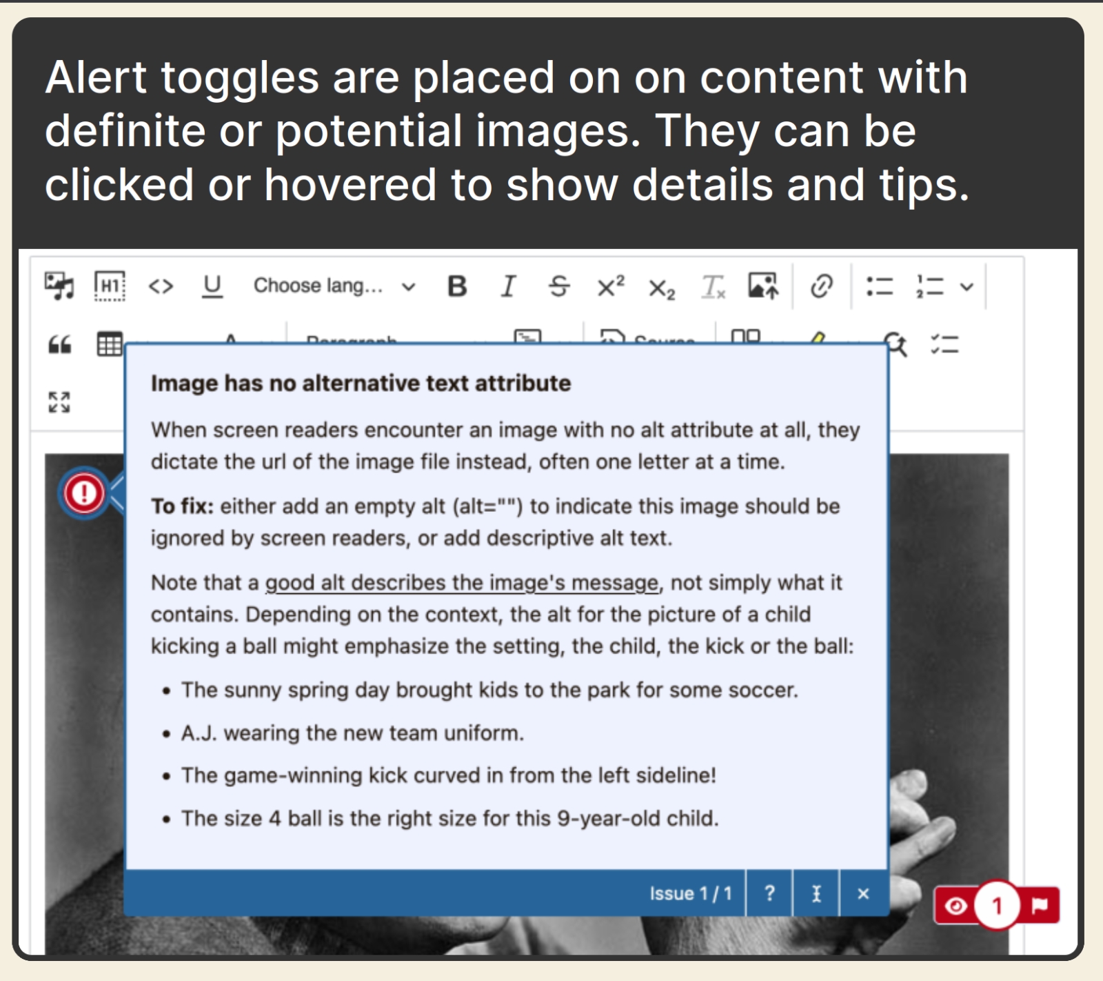 - Editor guidance to prevent new issues going forward